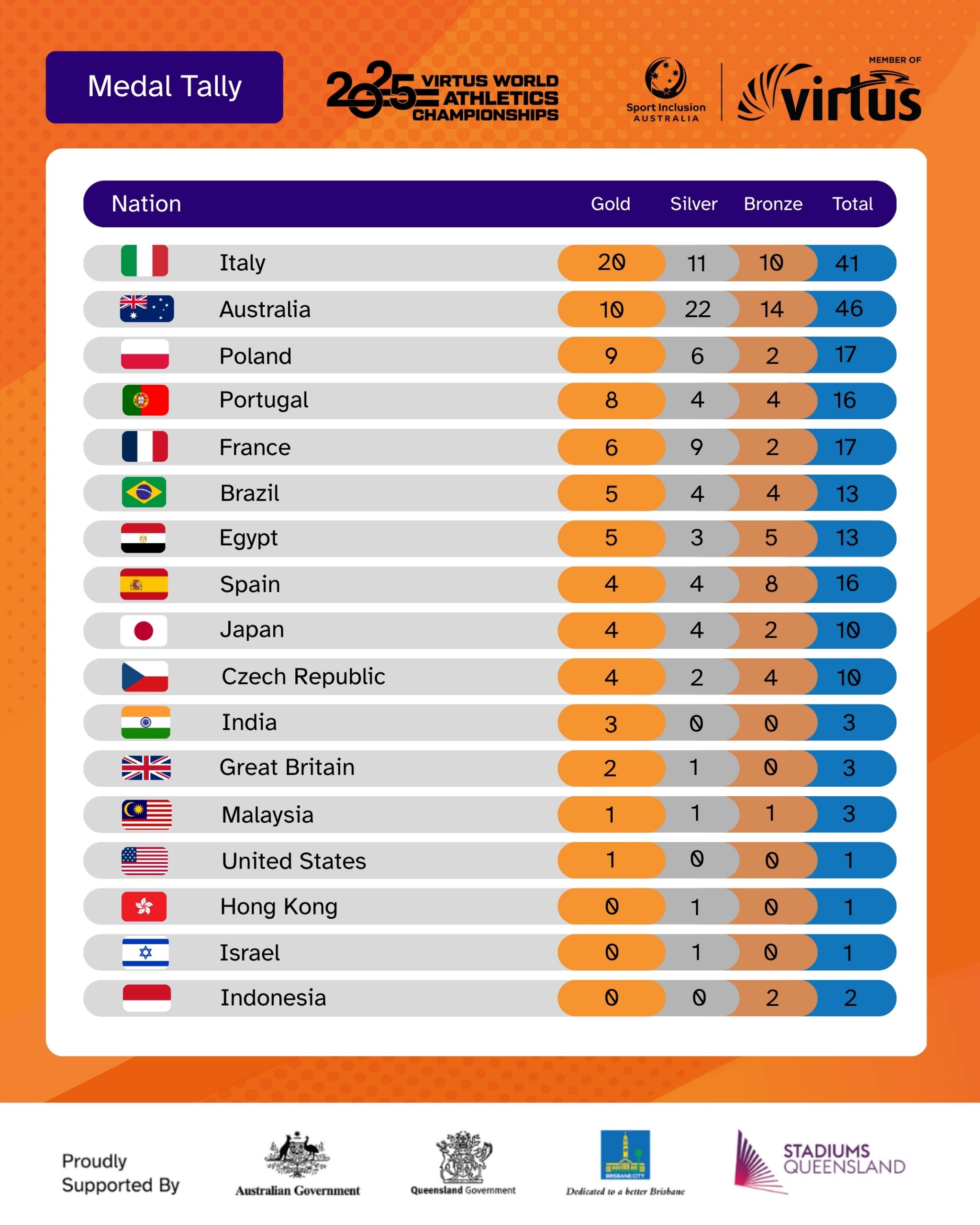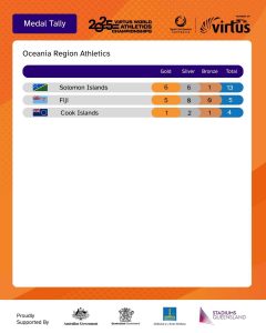 The Medal Tally from the 2025 Virtus World Athletics Championships.